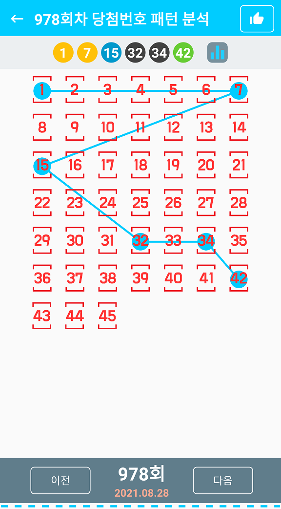 로또 978회 1등 당첨게임 수는 6게임으로 자동 5게임, 수동 5게임, 반자동 0게임이 당첨되었습니다. 제 978회 로또당첨번호조회 결과 1등 당첨번호는 '7,15,34,1,32,42'이고 보너스. 1등에 당첨되신 분들은 모두 10명으로 서울 1곳, 부산 3곳, 대구 1곳, 인천 1곳, 경기 5곳, 충북 1곳, 충남 1곳, 경남 1곳 입니다. Aug 28, 2021 · 978회 로또 당첨 번호 : Aug 28, 2021 · 이번주 로또 978회 당첨번호 (추첨일 2021.08.28)는 1,7,15,32,34,42 이며, 보너스 번호는 8입니다.
